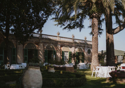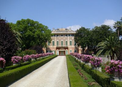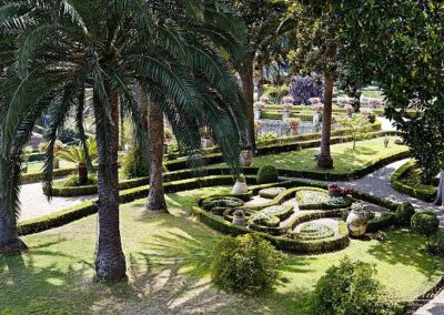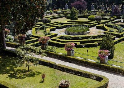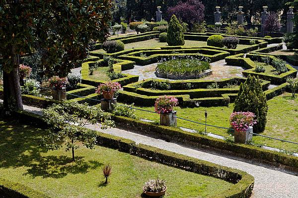 Il vasto giardino che circonda la villa unisce diversi stili: dal giardino all’italiana, con la sua simmetria e la presenza di sculture e fontane, al giardino alla francese, caratterizzato da ampie visuali e terrazze che si adattano alla morfologia collinare del luogo.